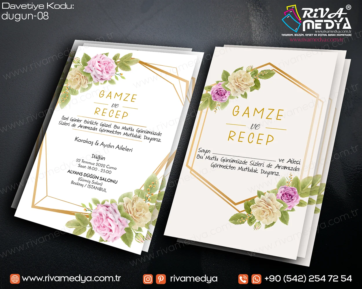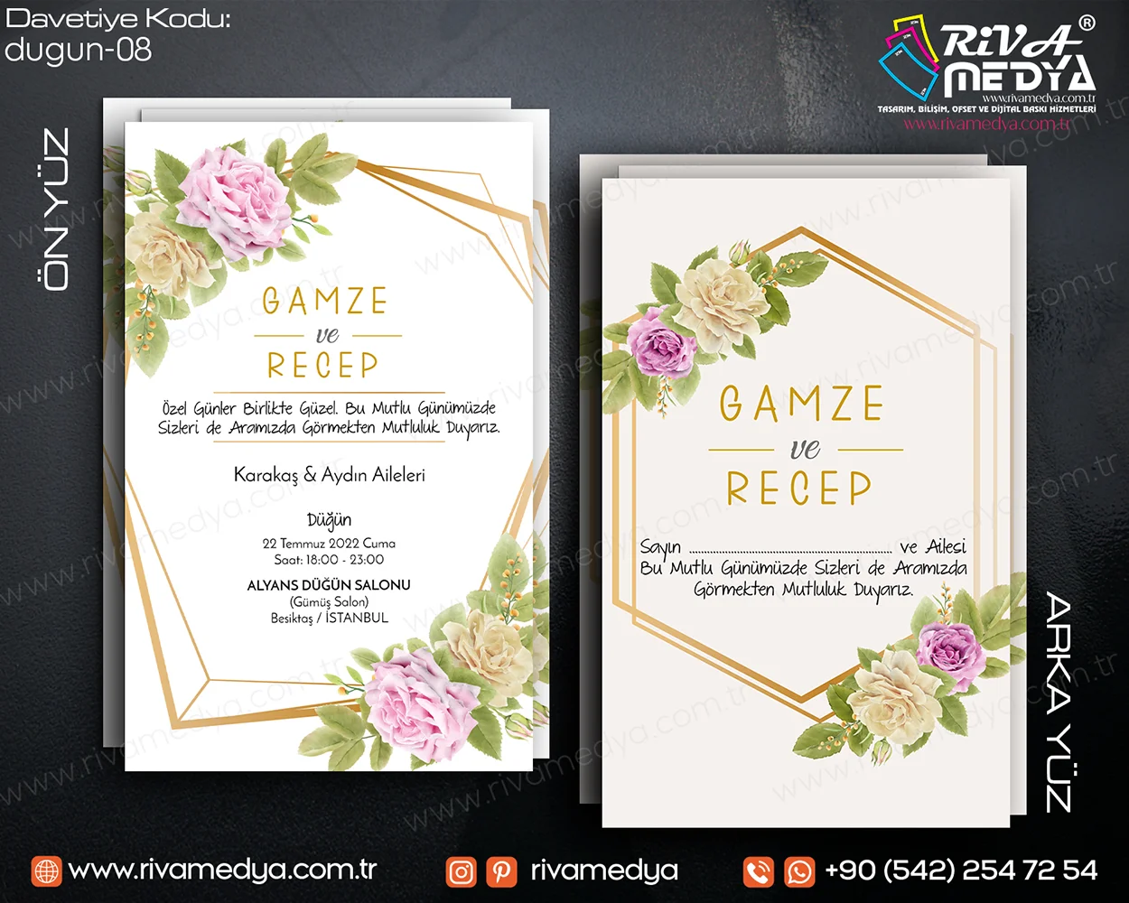 Davetiye tasarımlarımız zarfsız sunum için özenle hazırlanmıştır. İsimlik bölümü, tasarımın arka yüzünde yer alır. Selefon kaplamasıyla kaplanarak ışığa, yırtılmaya, suya ve diğer dış etkenlere karşı daha dayanıklı hale getirilmiştir. Bu sayede davetiyeleriniz normal davetiyelerden çok daha uzun ömürlü ve sağlam olur. Parlak görünümü, davetiyenize şıklık ve dikkat çekicilik katar.